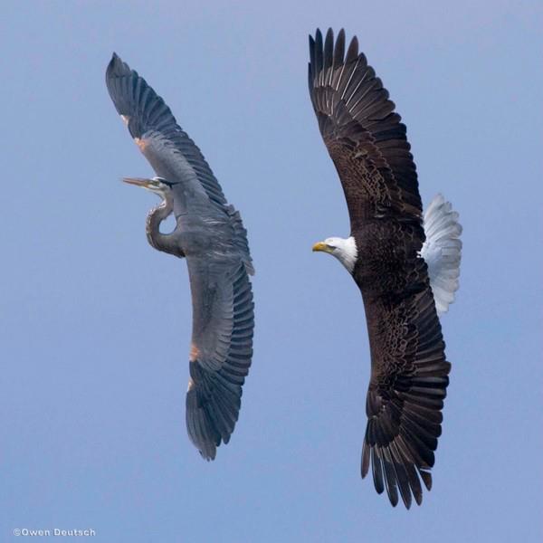 This award-winning photograph was taken by Owen Deutsch in Fox Lake, IL and is a North American Nature Photography Association (NANPA) 2011 Top 10 Showcase Winner. This Bald Eagle was chasing the Great Blue Heron away from the eggs in her nest. It wasn’t trying to kill the Heron or she would have done so long before this once in a lifetime shot was captured. (Owen Deutsch / owendeutsch.com)