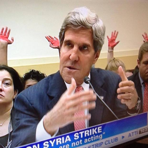 Codepink raising bloody hands during Kerry’s Syria fear mongering on the hill today.