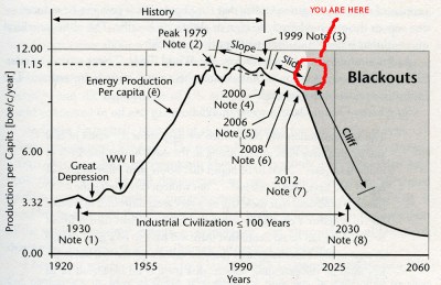 A number of environmentalists have been sanely and prophetically decrying the destruction of the biosphere for decades. This is another key part of the equation. They have pointed to alternative energy supplies such as wind, solar, geothermal, and biomass as steps toward protecting the ecosystem. But very few understand the infrastructural problem that must be addressed if the crisis is to be solved in any rational matter. [G: Mike has already stated that it is too late and I agree with that assessment. We’ve had windows open but they are slamming closed now.] Peak Oil will likely turn human civilization inside out before global warming does, unless – and there are signs that this is happening – oil and gas shortages elicit a tragically shortsighted return to coal.